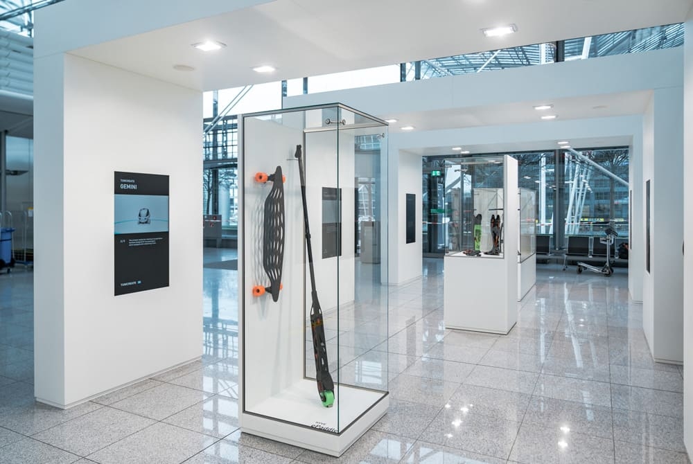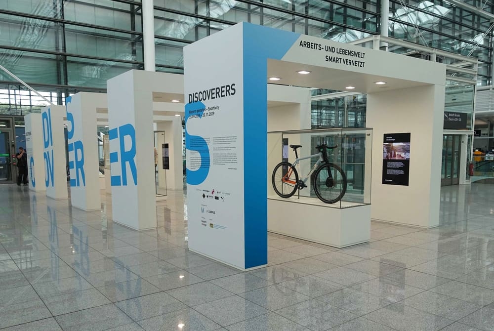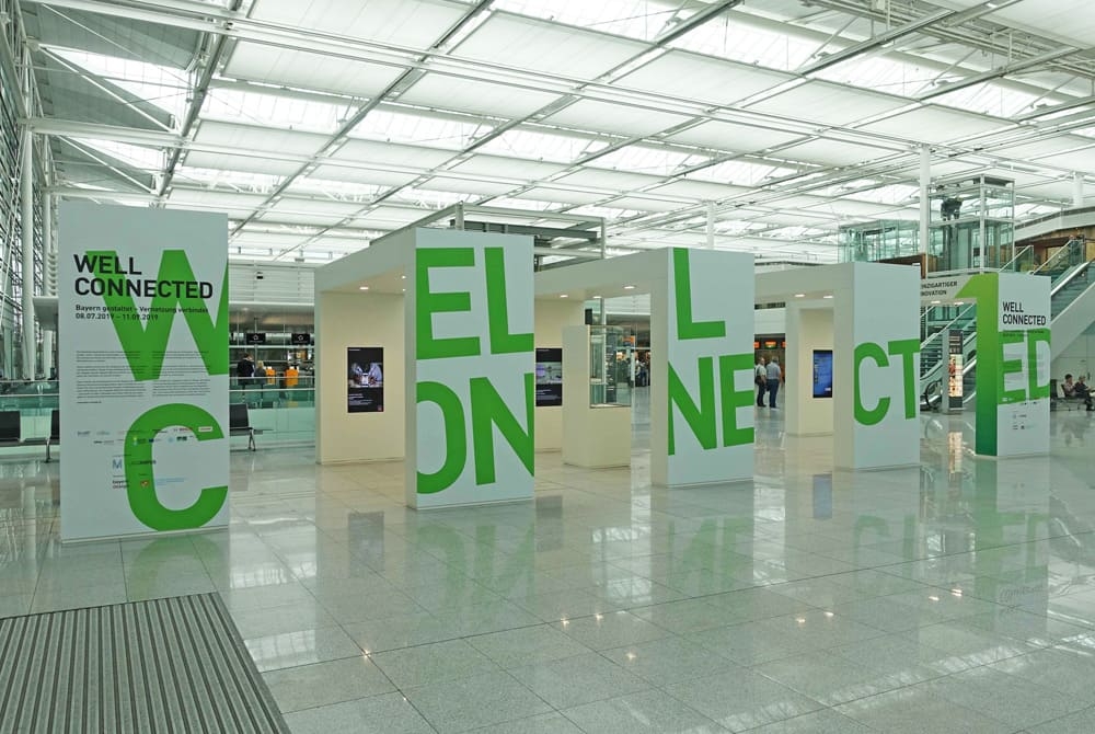atelier damböck hat für den Abflugbereich im Terminal 2 des Münchner Flughafens ein Ausstellungssystem aus fünf großen Präsentationsbögen konzipiert und gebaut. In den vergangenen zwei Jahren wurden hier zehn Ausstellungen mit vielen unterschiedlichen Exponaten gezeigt. Durch die Ausstattung der Ausstellungsbögen mit großen Bildschirmen können zusätzlich zu den Exponaten in großen Glas-Vitrinen auch Multimedia-Inhalte in Bild und Ton präsentiert werden. Die Fluggäste haben so die Möglichkeit während ihrer Wartezeit auf knapp 80m² auf Entdeckungstour zu gehen.