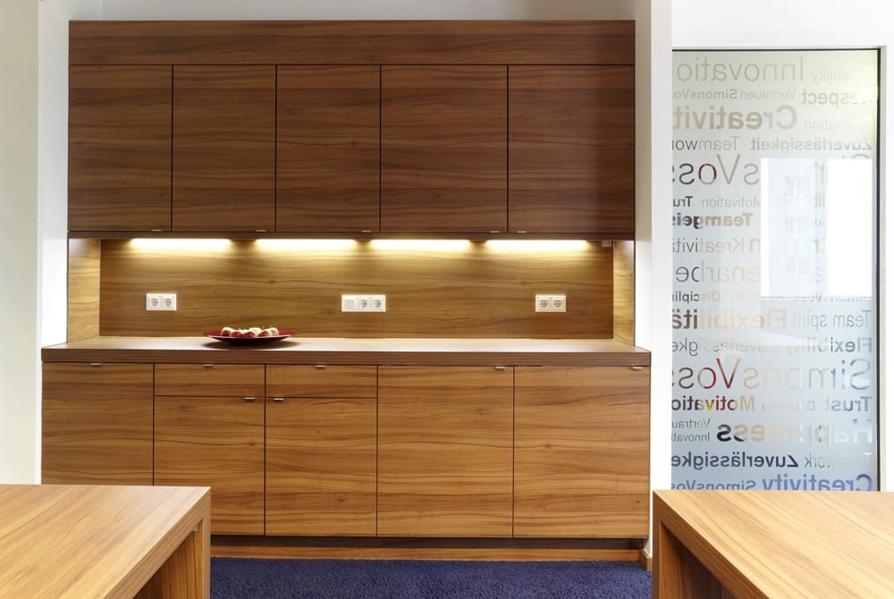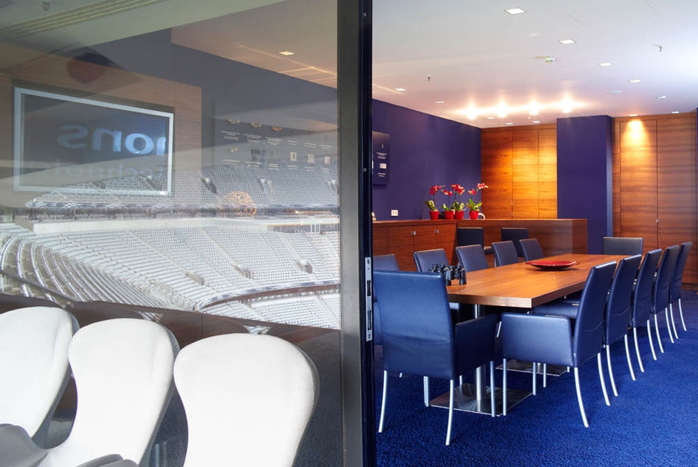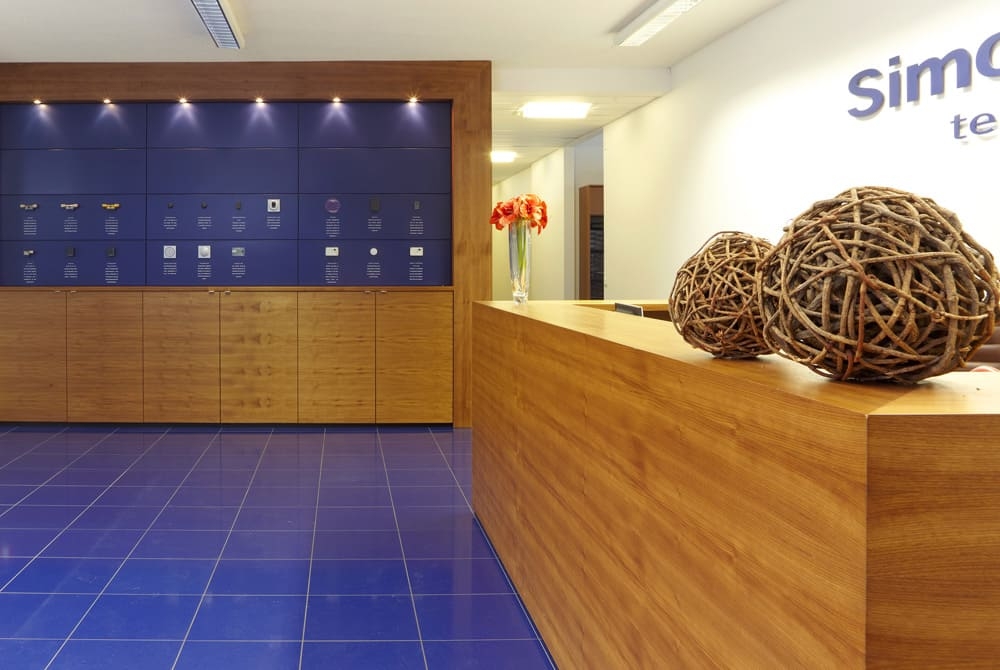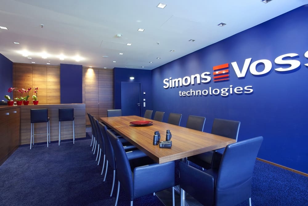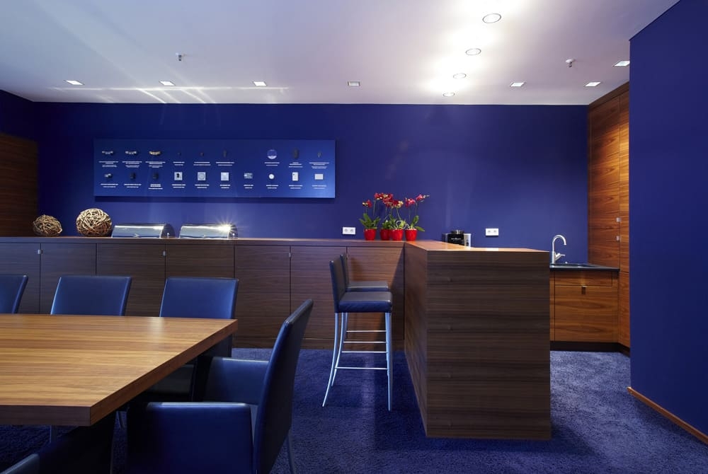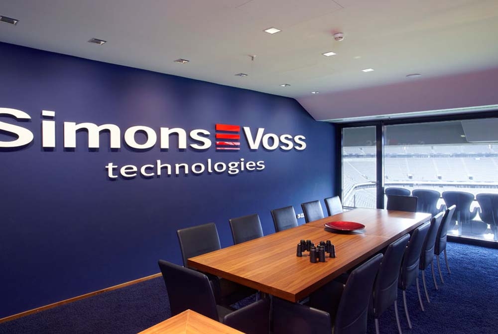 atelier damböck gestaltete für SimonsVoss in Unterföhring bei München den Empfangsbereich, die Cafeteria sowie eine Fußball Loge mit edlen Materialien. So fühlen sich Mitarbeiter und Kunden sofort wohl.