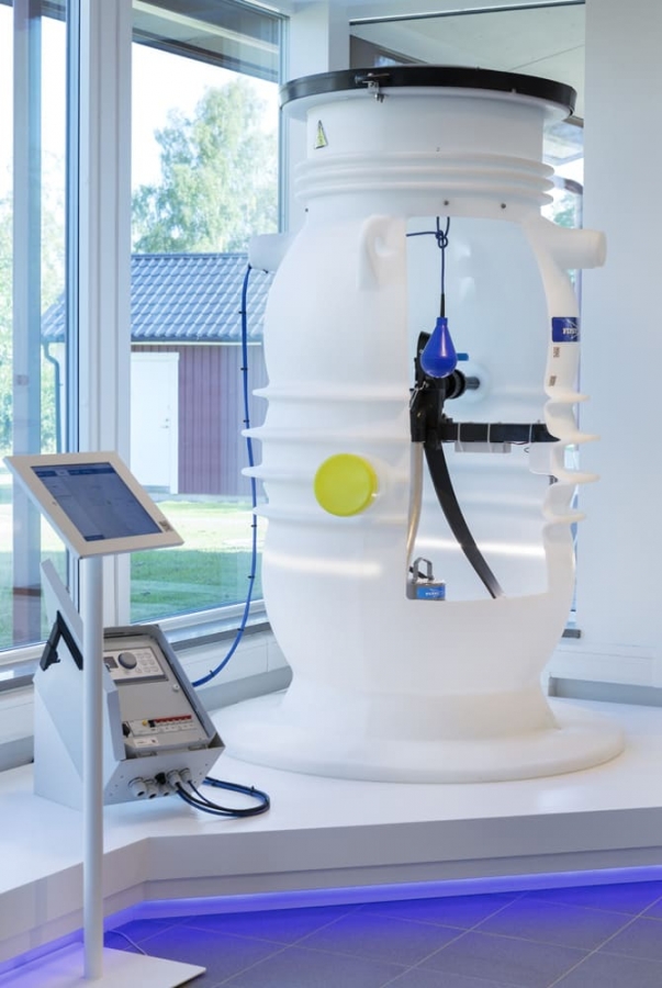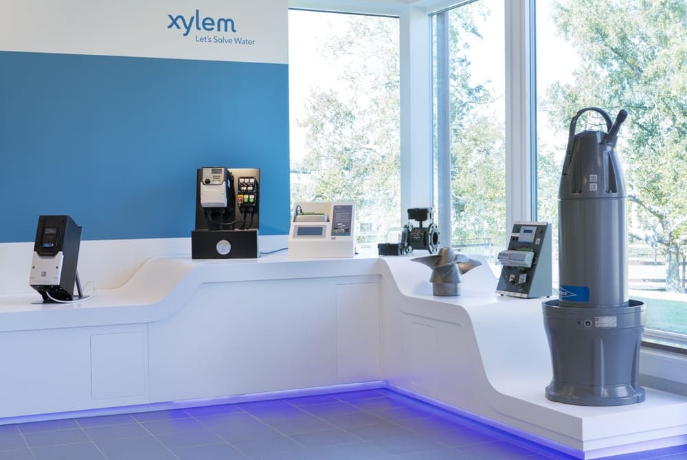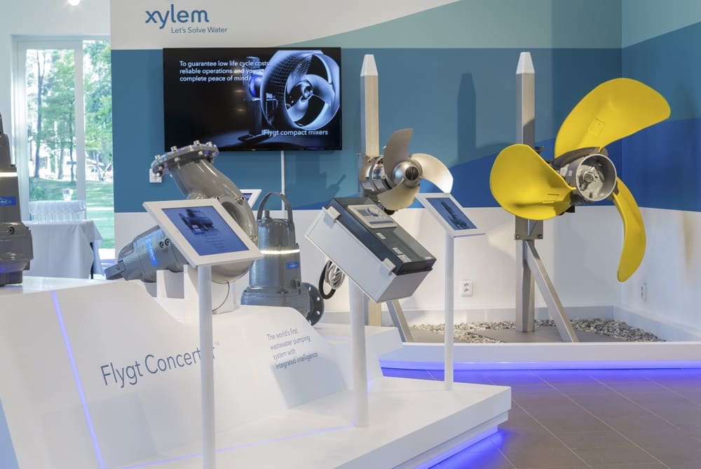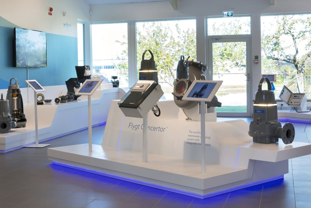 atelier damböck hat den Showroom von Xylem Water Solutions im Besucherzentrum neben der globalen Fertigungsstätte im schwedischen Emmaboda gestaltet.